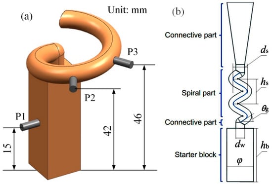 The main structural parameters of the spiral part included the spiral pitch hs, the spiral diameter ds, spiral angle θ and the spiral channel diameter dw, as presented in Figure 1b. Among these parameters, the hs, ds and θ have the following relationship [10]: