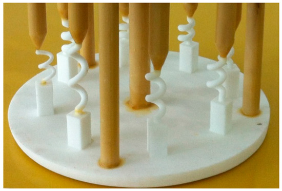 Subsequent to conversion into the STL file format, the casting model was directly printed using ProJet CPX3000 Plus equipment—the white wax mold from this 3D printing is presented in Figure 2. Consequently, the selectors were solidified alongside other processes.