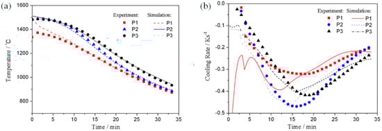 Comparison of temperature and cooling rate curves from experiment and simulation: (a) temperature change with time and (b) cooling rate curve.
