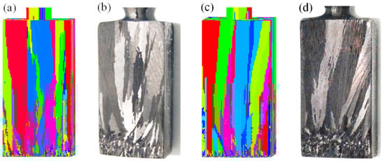 Comparison of microstructures in real starter block of spiral selector from experiment and simulation: (a) simulation result (front side); (b) experimental result (front side); (c) simulation result (reverse side) and (d) experimental result (reverse side); starter block dimensions: 10 mm × 10 mm × 30 mm.