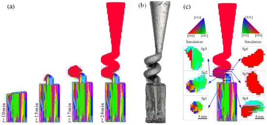 Comparison of grain growth in spiral part during experiment and simulation: (a) microstructure evolution simulation; (b) experimental result and (c) comparison of microstructure morphologies in different sections; structure of spiral part: ds = 6 mm and hs = 10.9 mm, θ = 30° and dw = 5 mm.