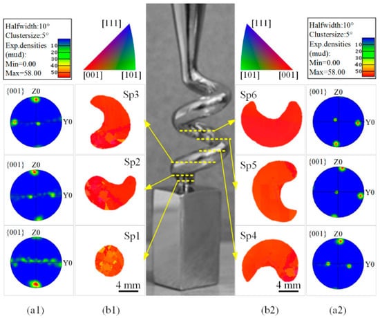 EBSD orientation imaging microscopy (OIM) of different cross sections in spiral part (a1) and (a2): pole figures (PF); (b1) and (b2): inverse pole figures (IPF); structure of spiral part: ds = 12 mm, hs = 14 mm, θ = 20° and dw = 5 mm.