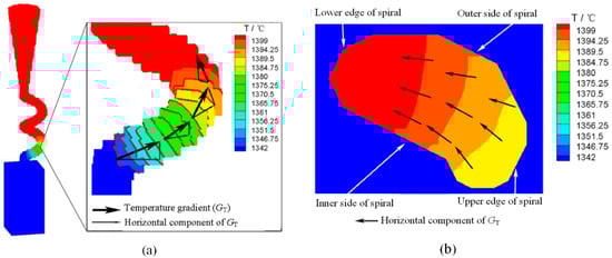 Simulation result of spiral temperature field distribution: (a) local temperature distribution of selector and (b) temperature gradient horizontal component in cross section.