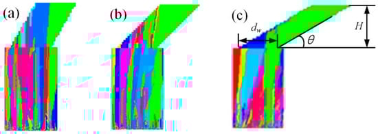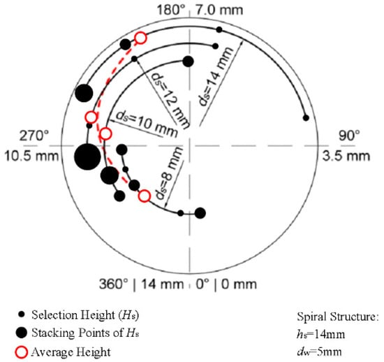 Moreover, the geometrical constraint by the spiral angle was related to the tunnel diameter dw. In Figure 10, when the design height H was higher than dw·tan(θ), the geometric constraint effect of the spiral angle completely played out and only grains that were close to the right edge of the spiral were selected. Therefore, the spiral pitch hs must match Equation (12). If the grains grew to the height hs, the effect of Effect 2 completely played out.