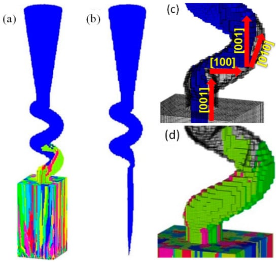 The actual grain selection occurred in a 3D spiral tunnel, based on a combination of the aforementioned two effects. Figure 11 presents the grain competition growth and elimination process in the 3D selector simulation. In Figure 11c, the grain with a positional and orientation advantage grew into the spiral part, which further exhibited horizontal growth in the [100] direction and lateral growth in the [010] direction, finally dominating the competitive grain growth. Figure 11d presents that the other grains that entered the spiral part also grew at a certain height, whereas the growths were blocked by the spiral tunnel wall and the dominating grain, being eventually eliminated.