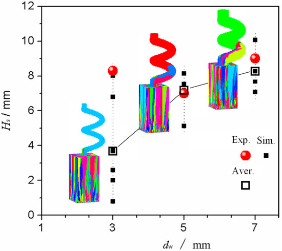 The spiral tunnel dw limited the number of grains that entered the spiral part. Experiments and simulation trials were conducted to further determine the effect of dw on grain selection. When a certain section was completely filled with a single crystal structure, the distance between this section and the bottom of the spiral part could be defined as the single crystal selected height (Hs). Figure 12 presents a comparison of Hs in selectors with different dw. When the dw increased, the average value of Hs increased and the grain selection effect was weakened, mainly because the number of grains that entered the spiral part was lower and the crystal selection process was completed significantly quickly when the dw was thinner. In addition, the crystal selection range was wide when the dw was low. Consequently, the apparent position of Hs was unstable. This phenomenon occurred because the number of grains that entered the narrow tunnel was low and the grain selection randomness was enhanced. Contrarily, the effect of the grain selection’s randomness was weakened and the appearance height of single crystal (Hs) appeared more concentrated when the dw was high. Additionally, all the results for Hs were lower than 14 mm along a spiral pitch under these study conditions, which indicated that the use of a 1-turn spiral structure was sufficient for the single crystal selection.