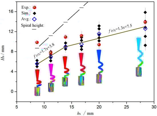 The increase in Hs exhibited a turning point at 14 mm as the hs increased. Consequently, a high hs value would consume a high amount of material and increase the solidification time. The maximum hs was 14 mm under these study conditions and the maximum hs was recommended to be 1.17 ds, according to the proportional relationship between hs and ds (Equation (11)). Additionally, the upper and lower spiral tunnels could not coincide with each other in the casting shell, which meant that the hs should be at least double the shell thickness hm; also, Equation (12) was considered to fully include the role of Effect 2. Therefore, the minimum value of hs could be calculated as follows: