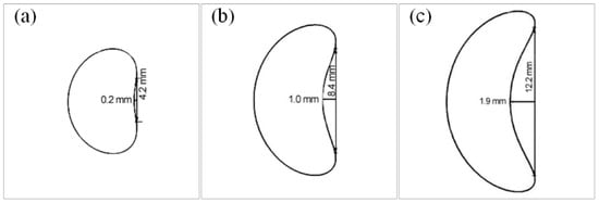 Cross-section shapes of spiral part with different hs (ds = 12 mm and dw = 5 mm): (a) hs = 8.7 mm, θ = 13.0 and BD = 0.09; (b) hs = 14.0 mm, θ = 20.2° and BD = 0.3; and (c) hs = 20.1 mm, θ = 28.1° and BD = 1.12.