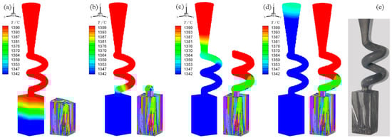 Mushy zone distribution, microstructure simulation results and experiment validation of improved spiral selector (hs = 14 mm and ds = 12 mm): (a) t = 10 min; (b) t = 15 min; (c) t = 20 min; (d) t = 25 min and (e) experimental result.