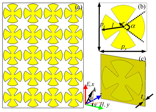 Figure 1 presents the design schematic of the proposed triple-band MMA, which consists of two functional metallic layers separated by a middle spacing layer. As shown in Figure 1b, the front view of the proposed MMA is a single metallic CSR structure as the basic unit cell, which can response the electric field of the incident EM waves. Similar to the previous design [38], the single CSR structure contains a circular patch at the centre and four circular sectors around the circular patch. The middle spacer is the dielectric substrate, and the selections of its thickness and permittivity is crucial since it affects the absorption properties of the MMA. The back metallic layer is a continuous copper film, and its thickness is larger than that of the penetration depth of incident EM waves, thus avoiding transmission. In the design of a triple-band MMA, the FR-4(loss) with permittivity of εr = 4.3 × (1 + i0.025) and thickness of 0.8 mm was selected as the middle dielectric substrate, and the continuous copper film with frequency-independent conductivity of σ = 5.8 × 107 S/m and thickness of 35 μm were selected as metallic layers. It was expected that the designed MMA is polarization-insensitive for both transverse-electric (TE) and transverse-magnetic (TM) modes due to the fourfold rotational symmetry of its unit-cell structure. The optimized geometric parameters were as follows: px = py = 20 mm, ts = 0.8 mm, r = 2.4 mm, l = 9 mm, and α = 70°.