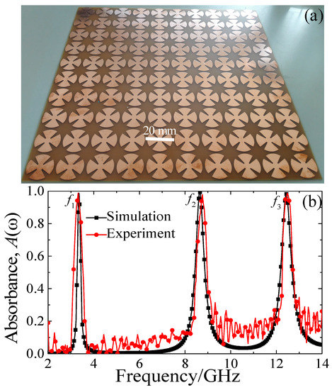 To verify the absorption properties of our design, numerical simulations were performed by using the frequency solver based on the finite integration technology (FIT) in CST Microwave Studio (CST China, LTD., Shanghai, China). In the simulation process, the unit-cell boundary condition was employed along the x-axis and y-axis direction; the unit-cell structure was illuminated by a normally incident plane wave with the electric field parallel to the x-axis and magnetic field parallel to the y-axis; and the wave vector was along the +z axis direction. For experiments, we fabricated the MMA sample with conventional printed circuit board (PCB) technology. The geometrical parameters and EM parameters of the unit-cell structure of the fabricated MMA were the same as in the simulation. In the MMA sample fabrication, we also used the copper and FR-4(loss) substrate as the metallic structure and dielectric layer, which were also the same as in the simulation. Finally, as shown in Figure 2a, a fabricated MMA sample with an area of 200 mm × 200 mm could be obtained. Two standard horn antennas connected to the network analyzer (Agilent N5244A PNA-X, Agilent Technologies, Santa Clara, CA, USA) were employed to measure the absorbance of the designed MMA in the EM anechoic chamber. In reflection measurement, the source and receiver horn antennas were each inclined at an angle of about 5° with respect to normal on the MMA sample. Before measurement of the sample, the aluminium plate of the same size replaced the sample for reference measurement [12,15]. To eliminate the near-field effect, the distance between the horn antennas and MMA sample was far larger than operational wavelength, which was 2.5 m in the EM anechoic chamber. The absorbance could be calculated through the formula A (ω) = 1 − R(ω) − T(ω) = 1 − |S11(ω)|2 − |S21(ω)|2, where the S11(ω) and S21(ω) were scattering parameters, and R(ω) and T(ω) were reflectance and transmittance as a function of frequency, respectively. In this study, only the reflection was considered, thus the absorbance was calculated only by using A (ω) = 1 − |S11(ω)|2, since the MMA was packed by a continuous film and there was no transmission.