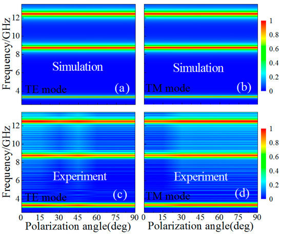 We studied, both numerically and experimentally, the polarization angle dependence of the proposed MMA for both TE and TM modes under normal incidence, as shown in Figure 3. From Figure 3a,b, as the polarization angle increased from 0° to 90° in steps of 15° at normal incidence, the simulated absorbance for both the TE and TM modes was unchanged, which was also in good agreement with the experiment (see Figure 3c,d). It was, therefore, further demonstrated that the designed triple-band MMA can keep polarization stability under normal incidence in practical applications.