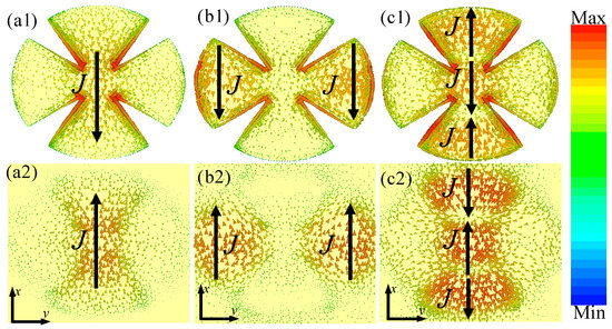 The surface current distributions of the (a1–c1) front and (a2–c2) back layer of the unit-cell structure at different resonant frequencies: (a1,a2) f1 = 3.35 GHz; (b1,b2) f2 = 8.65 GHz; and (c1,c2) f3 = 12.44 GHz. The solid arrow indicates the flow directions of surface currents at two metallic layers.