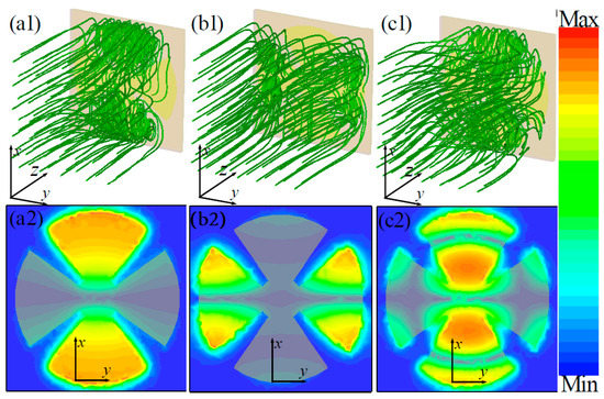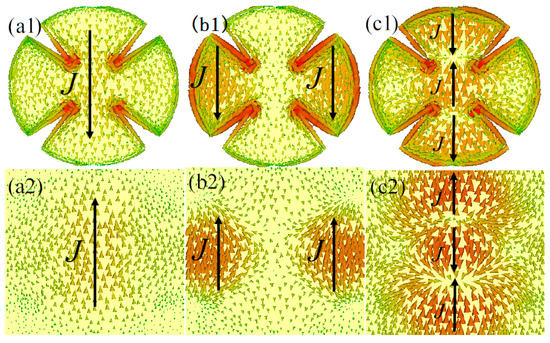 To further illustrate the resonance absorption properties of our proposed triple-band MMA, the distributions of the power-flow streams in the unit cell structure were also studied numerically, since this could provide interesting information about where and how the absorption occurs. From Figure 5(a1–c1), for the three resonant frequencies, the input power-flow streams were originally parallel in the space far from the unit-cell structure in the wave ports. When the power-flow streams moved close to the surface of the unit-cell structure, most of the power-flow streams across the CSR structure curled. However, when the power streams from outside the CSR structure area flowed into the dielectric substrate, this detail was very different at different resonant frequencies. At the lower resonant frequency (f1 = 3.35 GHz), as shown in Figure 5(a1), the power streams from the outside area into the dielectric substrate mainly focused on the upper and lower edges of the CSR structure. At the second resonant frequency (f2 = 8.65 GHz), most of the curled power streams were concentered on the left and right edges areas of the structure (see Figure 4(b1)). At the third resonant frequency (f3 = 12.44 GHz), the curled power streams were mainly concentered on the upper, middle and lower edges areas of the structure (see Figure 4(c1)). In all cases, the power density in the corresponding edge areas was at least one order larger than in other positions of the CSR unit-cell structure.