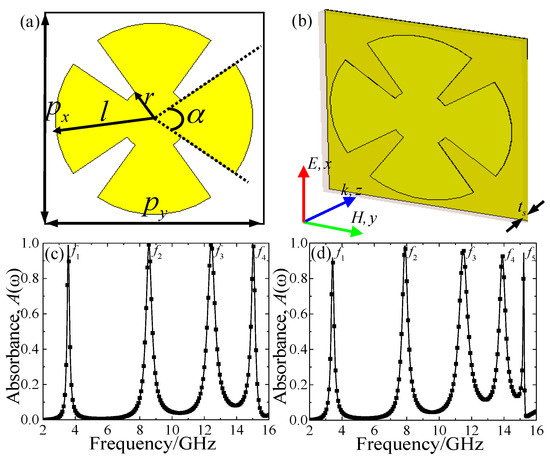 The number of perfect absorption peaks of the proposed the MMA structure can be extended based on the combination of one or more high-order responses by selecting appropriate geometric parameters of the unit-cell structure, as shown in Figure 6a,b. In the new designs, the period (px = py = 20 mm), the permittivity of the dielectric substrate, and the conductivity of metallic layers are the same as in Figure 1. For the four-band MMA, the optimized geometric parameters are as follows: ts = 1 mm, r = 3 mm, l = 9.3 mm, and α = 70°. For the five-band MMA, the optimized geometric parameters are given as: ts = 1.3 mm, r = 3.5 mm, l = 9.6 mm, and α = 75°. The simulated absorbance for the four-band and five-band MMAs are depicted in Figure 6c,d.