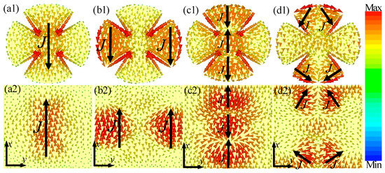 The surface current distributions of the (a1–d1) front and (a2–d2) back metallic layers of the unit-cell structure at different resonant frequencies: (a1,a2) f1 = 3.56 GHz; (b1,b2) f2 = 8.56 GHz; (c1,c2) f3 = 12.42 GHz; and (d1,d2) f4 = 15.04 GHz. The solid arrow indicates the flow directions of surface currents at the two metallic layers.
