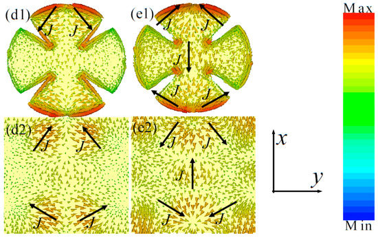 As shown in Figure 8(a1–d1,a2–d2), the distribution properties of the surface current of the front and back metallic layers of the unit-cell structure are similar to those in Figure 7. Thus, at resonant frequencies of f1 = 3.42 GHz, f2 = 7.88 GHz, f3 = 11.48 GHz, and f4 = 13.9 GHz, the high-level absorption properties mainly originated from the fundamental, second-order, third-order and fourth-order magnetic response of the proposed MMA structure. In addition, as shown in Figure 8(e1,e2) for the fifth resonant frequency (f5 = 15.22 GHz), five sub-antiparallel currents at the unit-cell structure form five current loops between the front and back metallic layers, resulting in the fifth-order magnetic resonance mode. Thus, five absorption peaks can be achieved easily based on the combination of the fundamental and higher-order magnetic resonance responses of the proposed MMA structure. Therefore, we also suggest that the LSP behaviors and effect of the spoof SPPs contribute to the four-and five-band absorption properties of our proposed MMA structure.