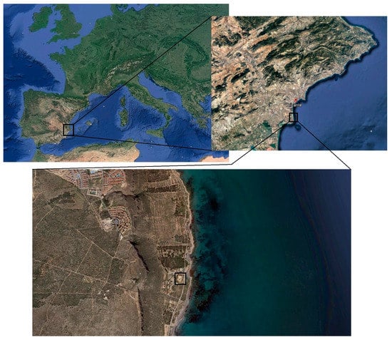 Location of the real exposure site (black line squares) for environment C. The samples were placed in an exposure station located in the Santa Pola’s Cape (Alicante province, Spain). The distance from this exposure site to the Mediterranean Sea was about 100 m. The satellite images were obtained using the Google Earth software (Google, Santa Clara, CA, USA).