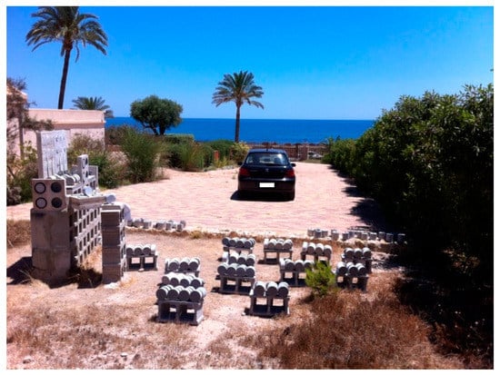 The third environment consisted of exposing the samples to a maritime real condition of Mediterranean climate, and it was called environment C. The samples were placed in an exposure station, located in the Santa Pola’s Cape (Alicante province, Spain) (see Figure 1), at approximately 100 m from the Mediterranean Sea, as can be observed in Figure 2. Therefore, the samples exposed to this environment C would be affected by the action of the airborne chlorides coming from sea water. In view of that, the location of the samples would accomplish the specifications of exposure class IIIa defined by the Spanish Code on Structural Concrete EHE-08 [40], which would be equivalent to exposure class XS1 (corrosion induced by chlorides from sea water without direct contact with it) indicated by the Eurocode 2 [41]. The group of samples exposed to environment C, were cured in a chamber at 95% RH and 20 °C along their first seven hardening days, before being placed in the exposure site. Many studies have shown [16,18,28,36] the importance of curing in the development of service properties of cementitious materials exposed to real environments. For this reason, in this work it was selected a curing period of seven days.