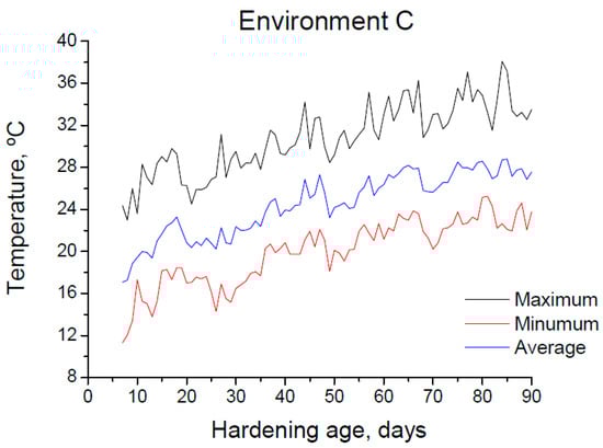 A similar result has been observed for CEM III specimens exposed to environments B and C. However, for those samples prepared using slag cement, the difference among both conditions was more pronounced (see Figure 8). For environment B, CEM III mortars showed an important loss of pore refinement compared to the optimum condition A, which was corroborated by the fact that the main pore family shifted towards higher diameters, as would indicate by their logarithm curves of differential intrusion volume versus pore size (see Figure 10). This could be due to the relatively low relative humidity of environment B, which would notably affect the development of slag hydration [4], making new solid formations more difficult. On the other hand, the pore network of CEM III samples hardened in environment C were hardly less refined than those noted for environment A. As has been explained for CEM I mortars, the higher temperature and relative humidity values reached in several periods of each exposure day to real in situ environment would facilitate the development of slag hydration. In that regard, several studies [4,27] have pointed out that the hardening temperature has an important influence in the development of microstructure and properties of slag cement based-materials. Therefore, the effect of high maximum temperature values for environment C (see Figure 6) had possibly played an important role in the relatively good results related to slag mortar microstructure obtained here.