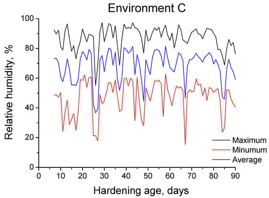 Daily maximum, minimum and average relative humidity registered in the station over the 90-day period of exposure to environment C.