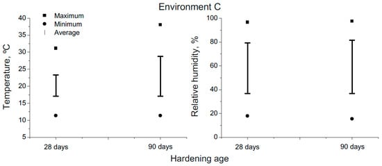 Absolute maximum, absolute minimum and interval of average temperature and relative humidity at which the samples were exposed to environment C for 28 days- and 90 days-period.