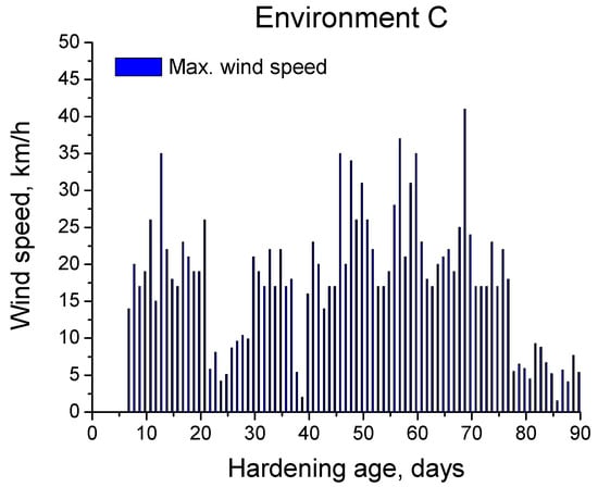 Finally, rain and wind are other environmental factors which could influence the water saturation degree of the samples, and as a consequence, the development of their microstructure and service properties. With respect to rain, it did not rain over the studied period. Wind is another factor which could affect the hydration of the samples, because fast wind could accelerate their drying process. The daily maximum wind speed registered in the station during the exposure interval is depicted in Figure 6. As can be observed, the maximum wind speed also showed high variability and its average value was about 20 km/h, although several peaks greater than 35 km/h were observed.