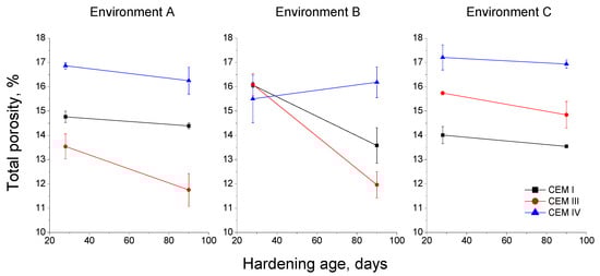 The results of total porosity as a function of hardening time in days are shown in Figure 7 for each environment. For environment A, the total porosity of CEM III mortars decreased between 28 and 90 hardening days, and it showed the lowest values of all the studied samples. This porosity also decreased for CEM I and CEM IV specimens exposed to environment A, although their values were higher than those observed for the CEM III ones. In relation to environment B, at 28 days the total porosity was very similar for all the mortars. Nevertheless, at 90 days this parameter hardly changed for CEM IV specimens, and it fell for the CEM I and III ones, being slightly lower for those mortars made using slag cement. For environment C, the total porosity hardly decreased with time for all the specimens. The highest values of this parameter for this condition were noted for CEM IV mortars and the lowest for the CEM I ones.