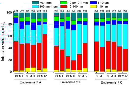 The pore size distributions for CEM I, III and IV mortars are depicted in Figure 8. For environment A, it is important to emphasize that microstructure was more refined in the long-term for mortars prepared using cements with additions, as shown by their higher proportion of smaller pores (sizes less than 10 nm) compared to CEM I mortars. The porous network hardly became more refined from 28 to 90 days for CEM I and III specimens hardened under environment A. However, for CEM IV mortars, there was an important pore refinement from 28 to 90 days, as shown by the rise of percentage of pores with diameters in the range of 10–100 nm. Regarding environment B, the less refined pore network corresponded to CEM III mortars. Furthermore, a loss of pore refinement with age for CEM I and III specimens was observed for this condition, while this microstructure refinement increased for CEM IV mortars between 28 and 90 days. For environment C, mortars prepared with CEM IV showed the least refined pore structure, whereas the most refined one was noted for CEM III specimens. In addition to this, a loss of pore refinement with time for CEM I and IV mortars exposed to environment C was noted, while the microstructure of CEM III ones hardly changed.