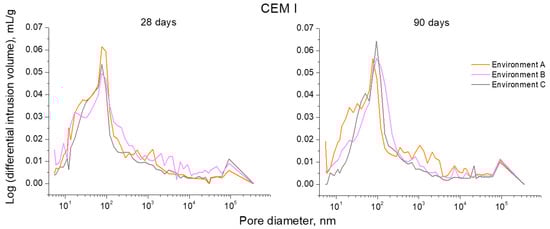 Curves logarithm of differential intrusion volume versus pore size obtained at 28 and 90 hardening days for CEM I mortars exposed to the three studied environments.