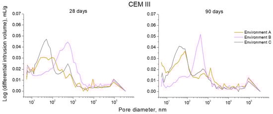 Curves logarithm of differential intrusion volume versus pore size obtained at 28 and 90 hardening days for CEM III mortars exposed to the three studied environments.