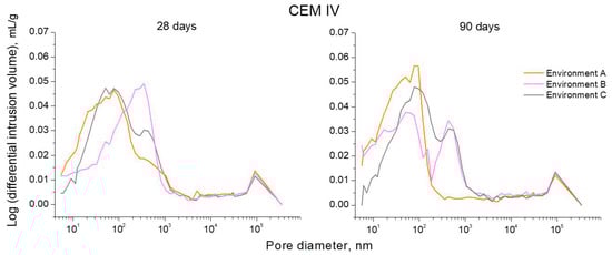 Curves logarithm of differential intrusion volume versus pore size obtained at 28 and 90 hardening days for CEM IV mortars exposed to the three studied environments.