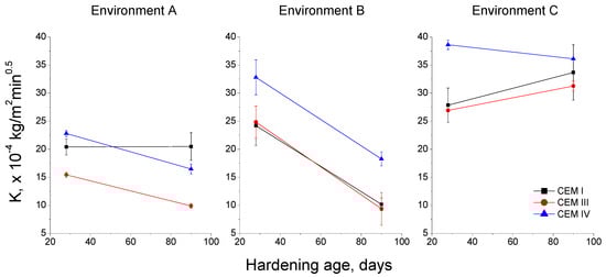 Firstly, the capillary suction coefficient K gives information about water ingress in the materials. The study of this parameter is important because water is the mean medium by which the ingress of aggressive ions is produced. For environment A, the values of the coefficient K (see Figure 12) were relatively low at 28 and 90 days, compared to the rest of the environments. These results would coincide with those obtained during the microstructure characterisation, and they would show the effects of a condition with both optimum temperature and relative humidity, which would favour the development of clinker and slag hydration [4,28], as well as fly ash pozzolanic reactions [28,29,33], reducing the coefficient K. For environment B, this parameter showed relatively high values at 28 days, but it greatly fell at 90 days. Again, this result was in keeping with previously discussed microstructure parameters. As has been explained, the great initial values of coefficient K would be produced by the relatively low relative humidity in the environment, which would slow down the development of hydration and pozzolanic reactions [4,28,51,52]. Furthermore, the highest values of this coefficient for environment B were noted for CEM IV mortars, which would indicate the delay of pozzolanic reactions of fly ash compared to clinker and slag hydration [33,47,48]. This is more noticeable for this environment B due to the slowing down of this hydration. For environment C, the coefficient K hardly changed with time and it showed the highest values of the all the studied conditions. Therefore, the beneficial effects of this real in situ condition on the microstructure for some of the analysed mortars, were not been noted for coefficient K. This could be due to the fact that the global percentage of capillary pores was similar, or even higher, for environment C, in spite of having a slightly greater pore refinement.