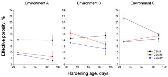 The effective porosity provides data about the fraction of the material accessible to water and, therefore for aggressive substances, such as chlorides [53]. The effective porosity results (see Figure 13) obtained for environment A were very similar to those obtained for coefficient K, as already discussed. In addition to this, it is important to note the lower effective porosity showed by slag and fly ash cement mortars exposed to this condition in comparison with CEM I ones, which would agree with their higher pore network refinement. Regarding environment B, the decrease of this porosity with time was not as noticeable as observed for coefficient K, although their higher values would denote the abovementioned effect of lower relative humidity of this condition [4,28]. Lastly, for environment C, the effective porosity hardly changed for CEM I and III mortars, and it fell for the CEM IV ones, despite the fact that at 90 days, the values of this parameter were similar to those obtained for environment B. As happened with coefficient K, the improvement of microstructure noted for some of the studied mortars kept under this environment C seemed not to have an influence on the effective porosity. The decrease of this parameter in the medium-term for CEM IV mortars would indicate the effects of the fly ash pozzolanic reactions, and the delay compared to clinker and slag hydration [33,47,48]. Nevertheless, it is interesting to emphasize that for all environments, both effective porosity and coefficient K were overall similar, or even lower, for CEM III and IV mortars at 90 days in comparison to those made with CEM I.