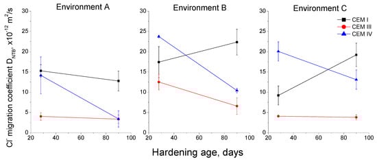 The results of the non-steady-state chloride migration coefficient DNTB for each environment can be observed in Figure 14. For environment A, this coefficient decreased with age for all the studied mortars, especially for the CEM IV ones, and at 90 days its values were lower for mortars with active additions than for those made with CEM I. For environment B, the migration coefficient fell with time for CEM III and IV mortars, and it increased for the CEM I ones. Again, slag and fly ash mortars exposed to environment B showed lower values of this coefficient at 90 days compared to those prepared using CEM I. For environment C, migration coefficient decreased for CEM IV specimens, increased for CEM I ones and stayed practically constant for those made with CEM III. For this environment, at 90 days, mortars with active additions also showed lower migration coefficients than CEM I ones.