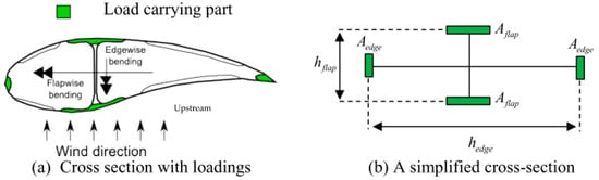 Using the simplified cross-section shown in Figure 1, the flap and edge-wise moment in the blade (see, e.g., []) can be found as follows: