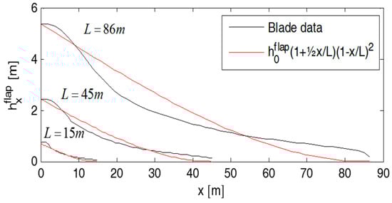 Following Equation (6) will result in blade geometries which are solely based on material strength. In reality, the blade geometry is given by a combination of structural and aerodynamic requirements. In Figure 2, Equation (6) is compared with typical blade cross-section variations, where the case , while the other two cases are representative blade geometries averaged from a number of known blade geometries. The blade height and width are specified such that Equation (6) is crossing the representative blade geometry in the largest value points which, for the thickness direction, is at the blade root while, for the width, it is at a point located away from that (see Figure 2). During this, it turns out that and , as a good approximation, can be assumed to follow linear functions, with L as the blade length: