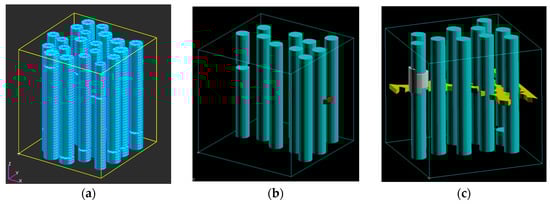 3D FE micromechanical model: (a) example of a 3D unit cell; (b) competition of damage modes: one failed fiber and a few microcracks in the matrix (red); and (c) two fibers have failed, the interface crack is formed in the vicinity of a fiber crack and the matrix crack is formed (ε = 0.015) (reprinted from [] with kind permission from Elsevier).