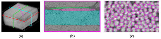 Segmentation of 0°, magenta: 45°, and green: 90° bundles, where the 0° is in the loading direction. (a) Cut planes, (b) Bundle segmentation, (c) Fibre segmentation.