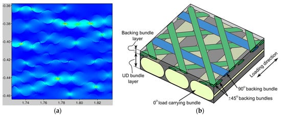 (a)The normal horizontal stress contour plot of a transverse-loaded 45° backing bundle and (b) the 3D structure where the resulting constitutive law will be implemented.