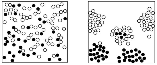Distribution of failed fibers in the case of clustered and random homogeneous fiber arrangements. The case of 100 fibers, five clusters, vc = 20%, damage parameter of 0.37 in random structures, and 0.43 in clustered structures (reprinted from [] with kind permission from Elsevier).