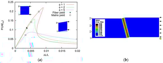 Smeared out finite element modeling of the fibre reinforced polymer matrix composite. (a) Smeared out material behavior; (b) Kink-band formation with yielding zone.