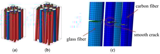Examples of unit cell FE models of glass/fiber hybrid composites (a) aligned; and (b) misaligned fibers, and simulated cracking in fibers (c) (reprinted from [] with kind permission from Elsevier).