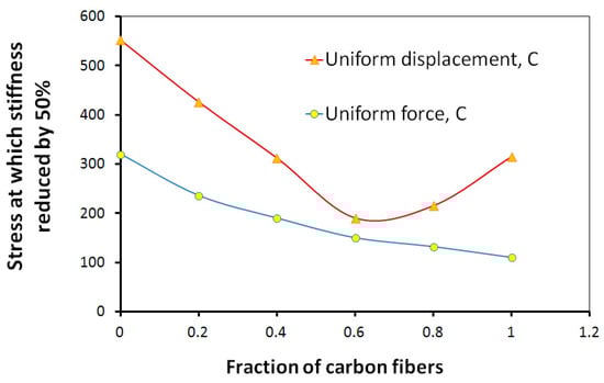 Further, the statistical model of composite cracking described in the previous section was applied to the hybrid glass and hybrid composites. Figure 10 shows the critical stress (corresponding to the load at which 50% of fibers fail), plotted versus the fraction of carbon fibers in hybrid glass/carbon fiber composites [], obtained using this model.