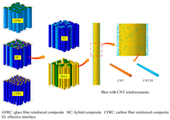 Figure 11 shows a schema of a unit cell model. In this model, polymer composites with glass fibers (GFRC), carbon fibers (CFRC), and hybrid fibers (HC) are reinforced with carbon nanotubes (CNT). The aspect ratio of CNTs was 1000, and they were distributed in the sizing of the fibers. The volume fraction of the CNT reinforcement is 0.46%. As a result of simulations, it was shown that the CNT enhances the fatigue performance (maximum stress and lifetime) in all considered composites. For the very low cycle loading, the CNT reinforcement leads to 25–43% increase in the stress while, for the millions of cycles, the CNT effect increases the stress by 64–120%. Similarly, the nanoclay particles located in the matrix or in the fiber sizing, ensure drastically enhanced fatigue lifetimes of composites [].