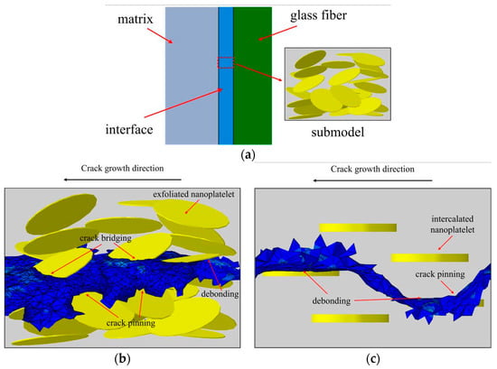 Schema of the model of thehierarchical fiber composite with nanoclay reinforcements (a) and simulated crack paths in submodels (aligned and randomly-oriented platelets (b,c)). Reprinted from [] with kind permission of Elsevier.