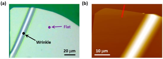 Few-layer GaSe flakes were transferred onto a flexible PDMS substrate by mechanical exfoliation from bulk 2H-GaSe purchased from HQ Graphene (Groningen, The Netherlands) using GEL film (Gel-Pak), similar to that for graphene []. To improve the adhesion of GaSe on PDMS, a layer of SU8 photoresist (~3 μm) was spin-coated onto the PDMS substrate in advance. The thickness of the obtained GaSe nanosheets was identified by combining the optical contrast in a microscope and AFM measurements. To introduce localized strain to the obtained GaSe nanosheets, the flexible PDMS were mechanically bent, as illustrated in Figure S1. This bending process leads to compression of the PDMS/SU8 top side surface and stretching of the under-surface. The relatively low ductility and excellent bend ability of GaSe allow wrinkles to be generated on the GaSe sheets. After releasing the flexible substrate, the substrate recovers its relaxed position, but strained wrinkles on the GaSe sheets remain. The direction of generated wrinkles are mainly dependent on the press direction. As shown in Figure S2, the PDMS substrate was pressed along the “x” direction, and the generated wrinkles were approximately parallel to the “y” direction. The PL spectroscopy measurements were performed on a confocal Raman spectrometer (Bruker, Karlsruhe, Germany) at an excitation of 532 nm. The excitation power is 5 mW with an integration time of 1 s. For the temperature-dependent measurements, a Linkam TST 350 liquid nitrogen low-temperature stage was mounted onto the micro-Raman system. The accuracy of the temperature control was ±1 K.