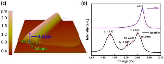 Figure 1a shows the optical image of the obtained GaSe flake on PDMS substrate. By the bending process (see Materials and Methods for details), a prominent wrinkle can be observed. The atomic force microscopy (AFM) measurements (Figure 1b,c) demonstrate that the flat GaSe flake has the thickness about 200 nm and the wrinkled structure is 14 μm in diameter and 2.3 μm in height. The line intensity profiles for the AFM image at flat and wrinkled positions are shown in Figure S3 in supplementary materials. Owing to the wrinkle, a certain value of localized elastic strain can be generated in the flake, which can be evaluated by the equation: ε = τ/ρ, where τ is the half-thickness of the GaSe sheet and ρ is the radius of curvature at a specific point. We assume that the central layer within the GaSe stack remains unstrained, while the outer curved surface of the sheet is stretched by ε and the inner curved surface is compressed by −ε. Details of the strain calculation can be found in the Supplementary Materials. In Figure 1d, the PL spectra measured at 100 K from flat (top) and wrinkled (bottom) points are shown. At low temperature (100 K), the main PL peak at 2.07 eV can be observed from the flat position. For the wrinkled one (ε ~ 0.5%, as calculated in the Supplementary Materials), the strain-induced funnel effect on the electronic band structure makes the major PL peak split into two peaks []. One strong peak is located at ~2.052 eV (peak I, direct band gap transition). The other one (peak II, indirect band gap transition) is located at 2.065 eV, which is much weaker than peak I and presented as a shoulder. Besides the splitting of the main PL peak, several new peaks can also be observed at lower energies, such as peaks III, IV, and V located at 2.024 eV, 2.005 eV, and 1.93 eV, respectively.