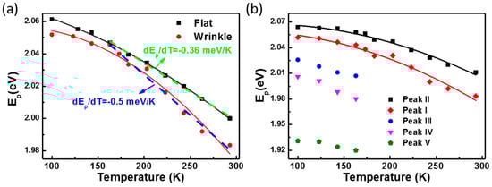 The temperature-dependent evolution of PL peaks from flat (unstrained) and wrinkled (strained) positions. (a) Black squares: the major PL emission from flat position. Red dots: peak I from the wrinkled position. The solid curves are the least-squares fits of data with the Varshni empirical equation. The dashed lines are the linear fits; (b) The five PL peaks from the wrinkled position.