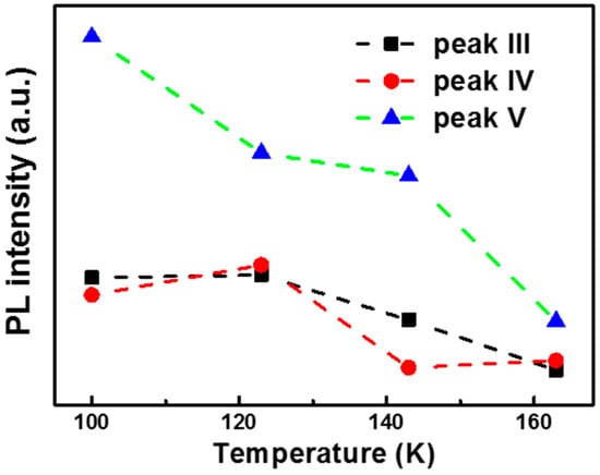 Additionally, for the wrinkled position, the emission intensity of peaks III, IV, and V gradually decreases and finally disappears at a temperature about 163 K, as shown in Figure 4. By comparing with the flat case, we can find that two conditions are necessary to make these peaks observable: low temperature and strain. Because the emission intensity of these peaks is highly dependent on the temperature, these peaks can be ascribed to the bound exciton recombination. When the temperature increases, more and more free excitons are released from the bound state, which makes the emission gradually disappear, as observed in the PL spectra in Figure 2b.